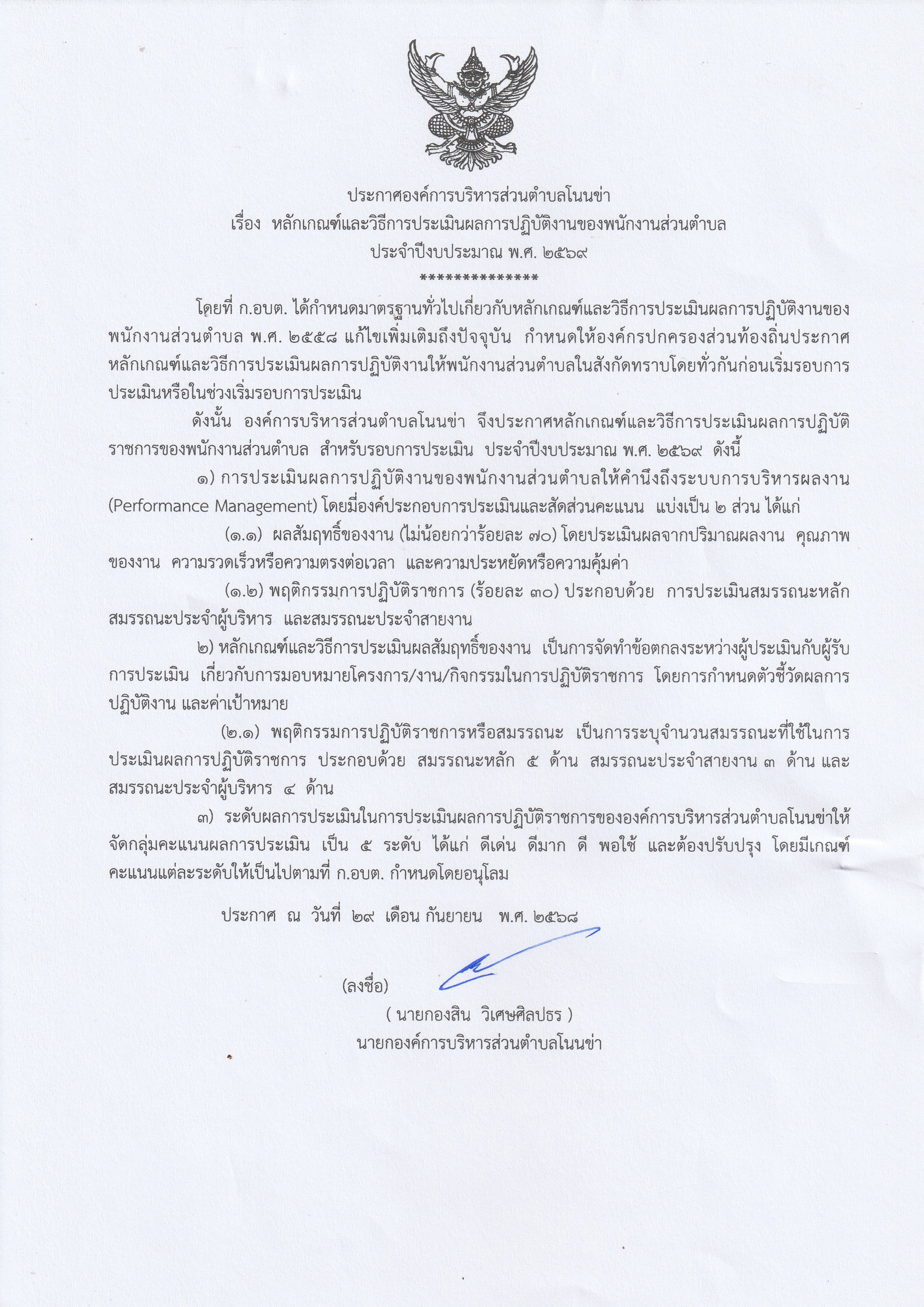 ประกาศองค์การบริหารส่วนตำบลโนนข่า เรื่อง หลักเกณฑ์และวิธีการประเมินผลการปฏิบัติงานของพนักงานส่วนตำบล ประจำปีงบประมาณ พ.ศ. 2569