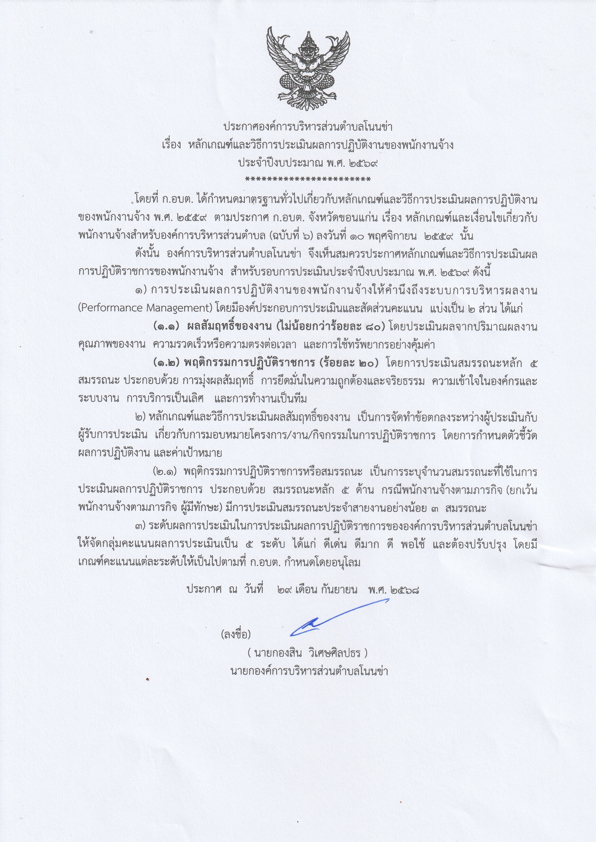 ประกาศองค์การบริหารส่วนตำบลโนนข่า เรื่อง หลักเกณฑ์และวิธีการประเมินผลการปฏิบัติงานของพนักงานจ้าง ประจำปีงบประมาณ พ.ศ. 2569