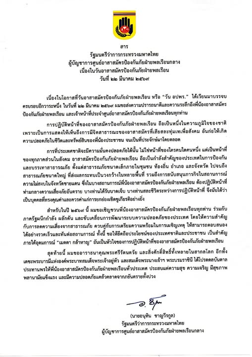 สารรัฐมนตรีว่าการกระทรวงมหาดไทยผู้บัญชาการศูนย์อาสาสมัครป้องกันภัยฝ่ายพลเรือนกลาง เนื่องในวันอาสาสมัครป้องกันภัยฝ่ายพลเรือน วันที่ ๒๒ มีนาคม พ.ศ. ๒๕๖๙