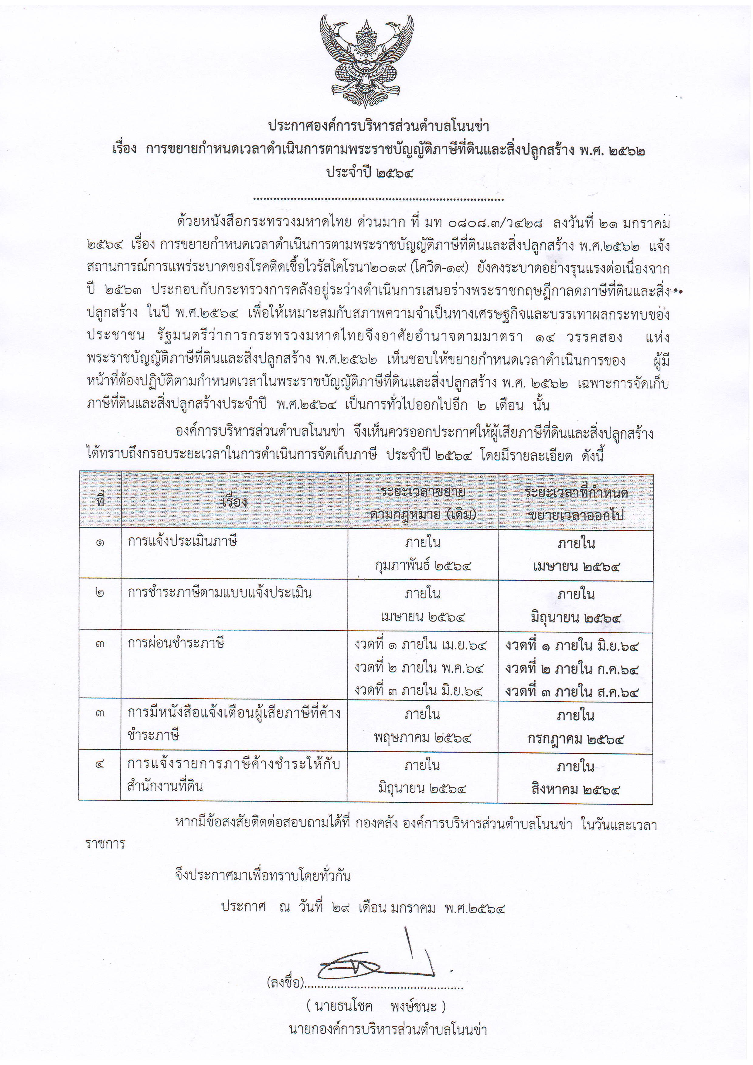 ประกาศ การขยายกำหนดเวลาดำเนินการตามพระราชบัญญัติภาษีที่ดินและสิ่งปลูกสร้าง พ.ศ.2562 ประจำปี 2564