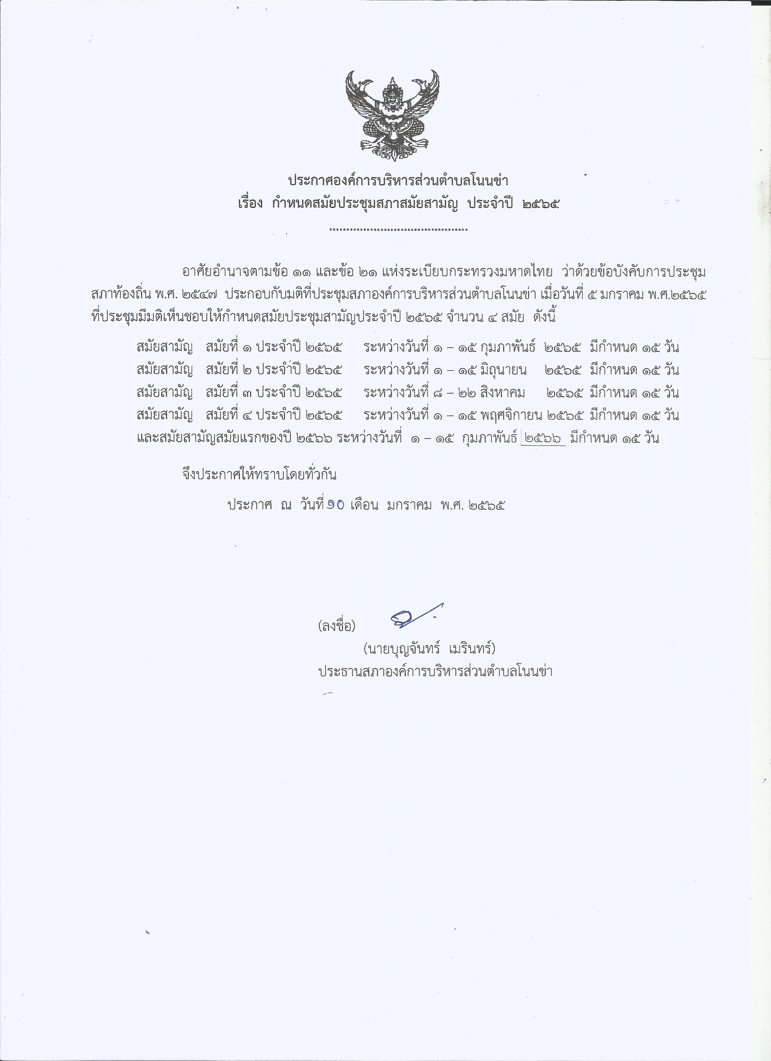 ประกาศองค์การบริหารส่วนตำบลโนนข่า เรื่อง กำหนดสมัยประชุมสภาสมัยสามัญ ประจำ 2565
