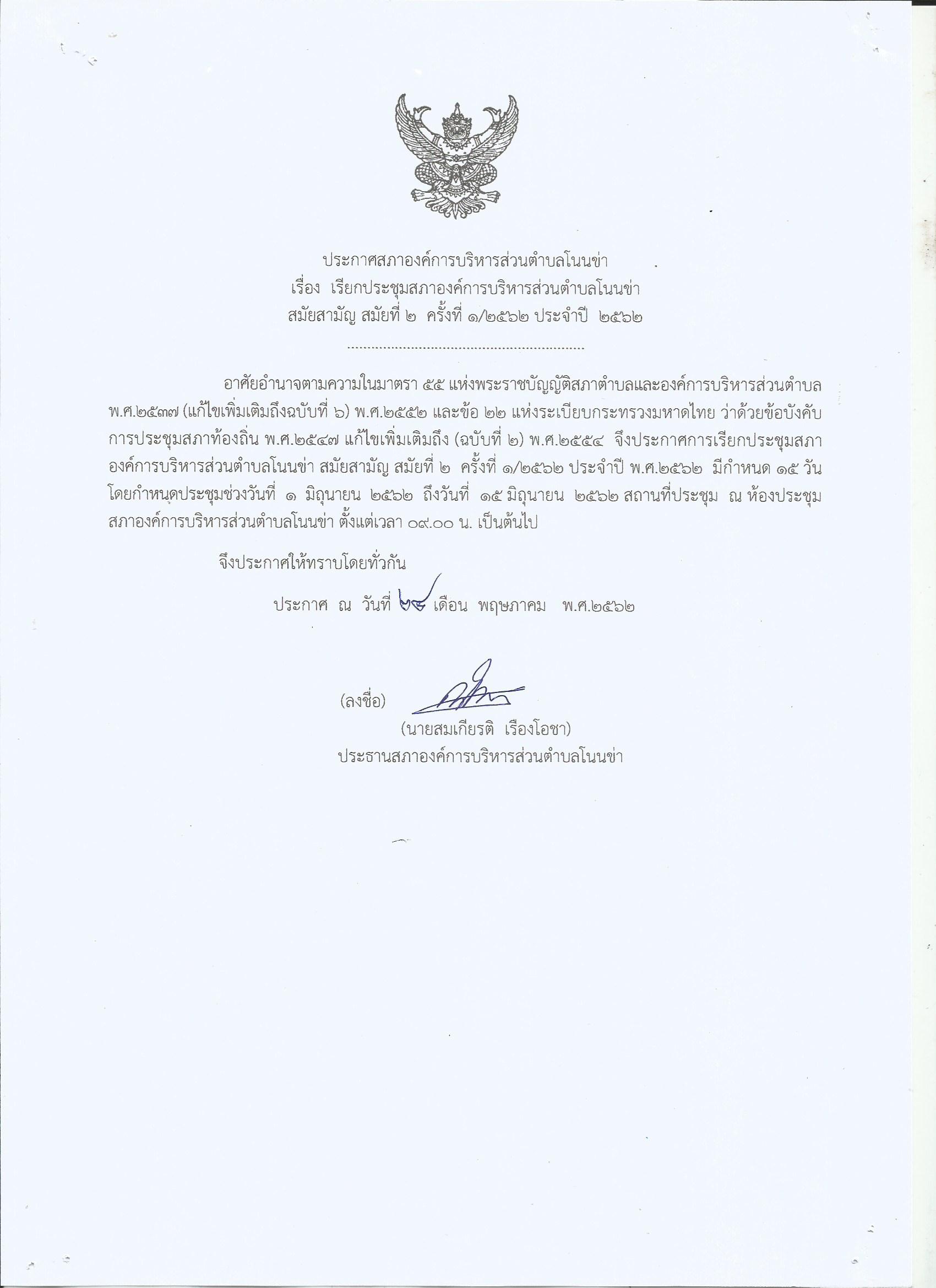 ประกาศสภาองค์การบริหารส่วนตำบลโนนข่า เรื่อง เรียกประชุมสภาองค์การบริหารส่วนตำบลโนนข่า สมัยสามัญ สมันที่ 2 ครั้งที่ 1/2562 ประจำปี 2562