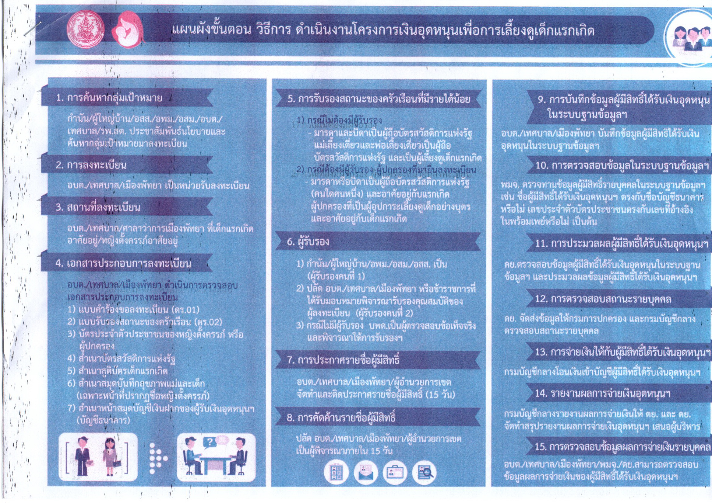 แผนผังขั้นตอน วิธีการ ดำเนินงานโครงการเงินอุดหนุนเพื่อการเลี้ยงดูเด็กแรกเกิด