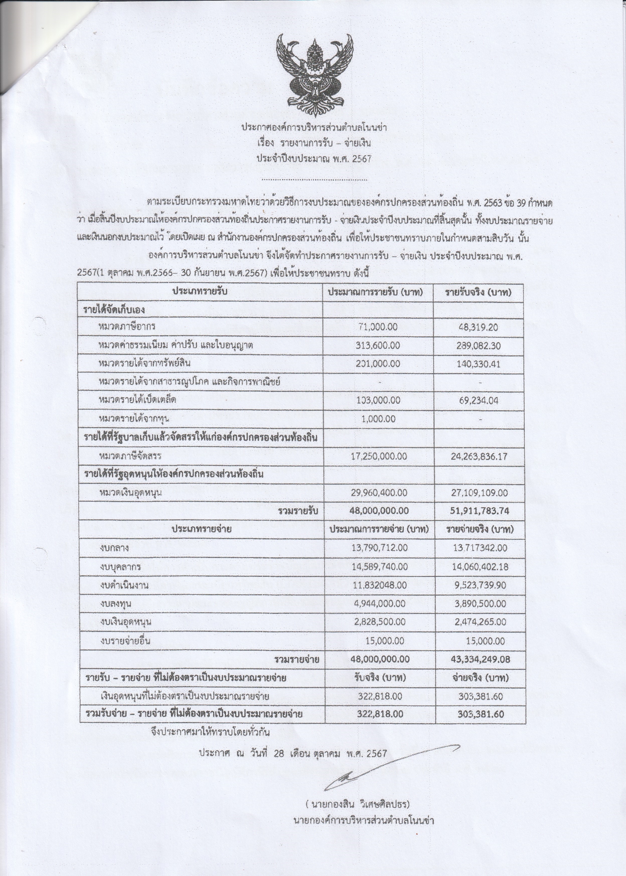 ประกาศองค์การบริหารส่วนตำบลโนนข่า เรื่อง รายงานการรับ - จ่ายเงิน ประจำปีงบประมาณ พ.ศ. 2567