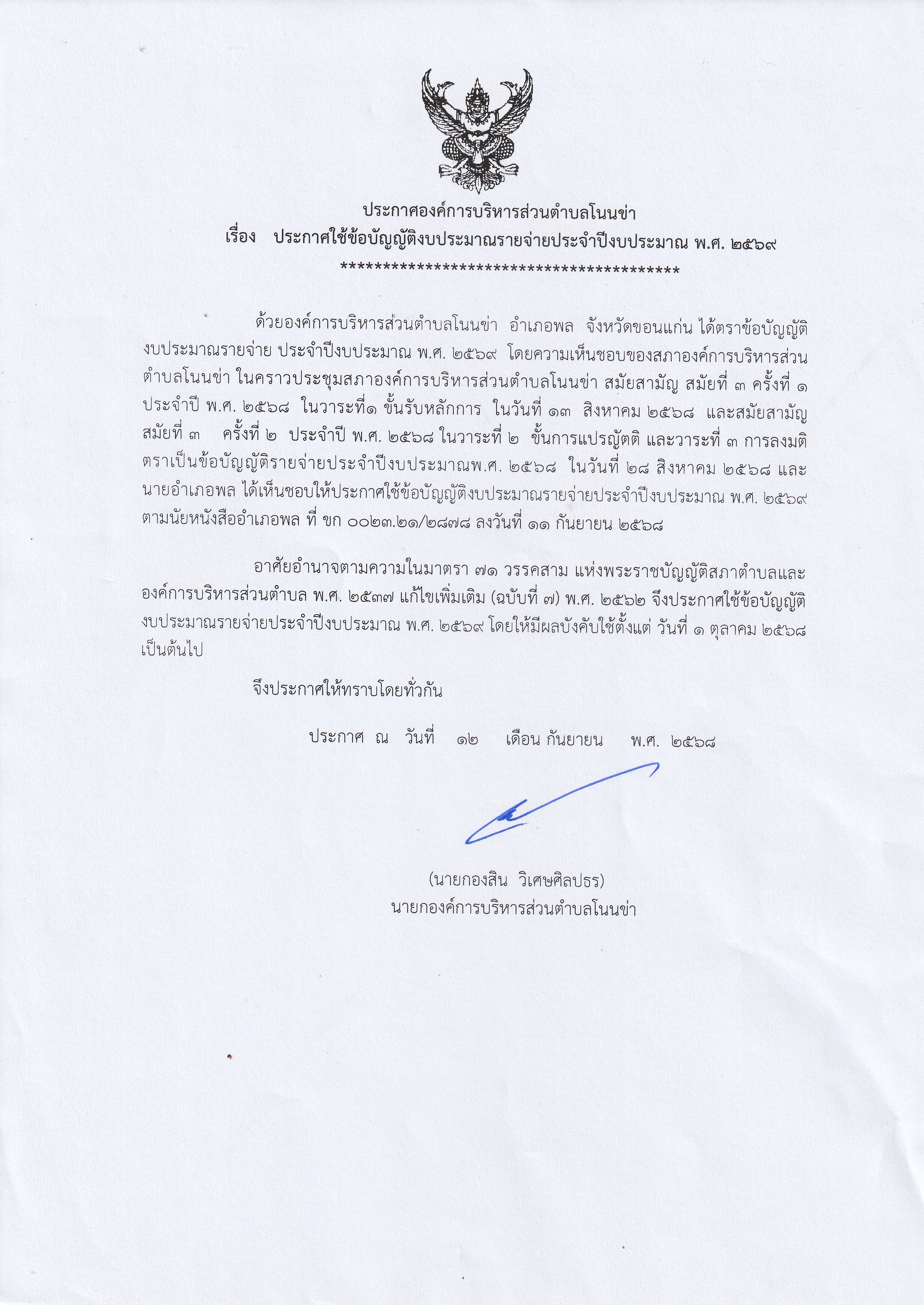 ประกาศองค์การบริหารส่วนตำบลโนนข่า เรื่อง ประกาศใช้ข้อบัญญัติงบประมาณรายจ่ายประจำปี งบประมาณ พ.ศ. 2569