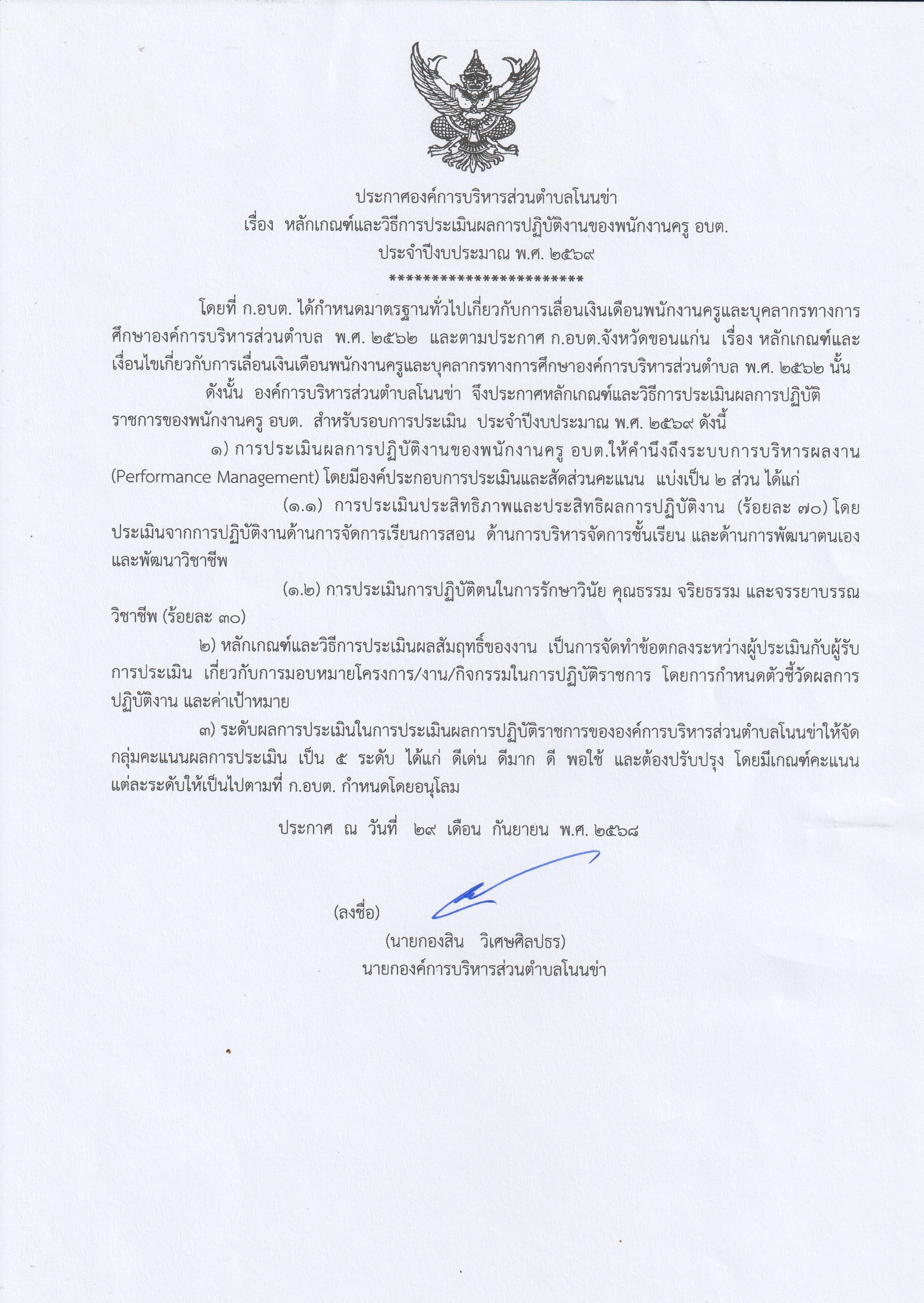 ประกาศองค์การบริหารส่วนตำบลโนนข่า เรื่อง หลักเกณฑ์และวิธีการประเมินผลการปฏิบัติงานของพนักงานครู อบต. ประจำปีงบประมาณ พ.ศ. 2569