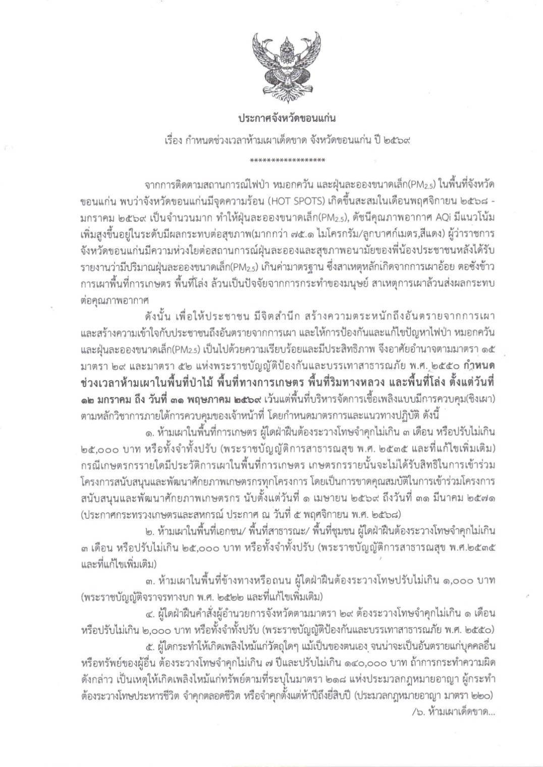 ประกาศจังหวัดขอนแก่น เรื่อง กำหนดช่วงเวลาห้ามเผาเด็ดขาด จังหวัดขอนแก่น ปี 2569